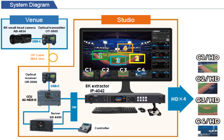 สามารถบันทึกภาพทั้งฉากในวิดีโอ 8K จากการถ่ายทอดกีฬา อีเวนต์สด และอื่นๆ พร้อมทั้งสามารถตัดส่วนที่ต้องการออกมาเป็นวิดีโอความละเอียด HD ได้สูงสุด 4 ช่อง ช่วยเพิ่มประสิทธิภาพในการออกอากาศและบันทึกวิดีโอได้อย่างมีประสิทธิผล