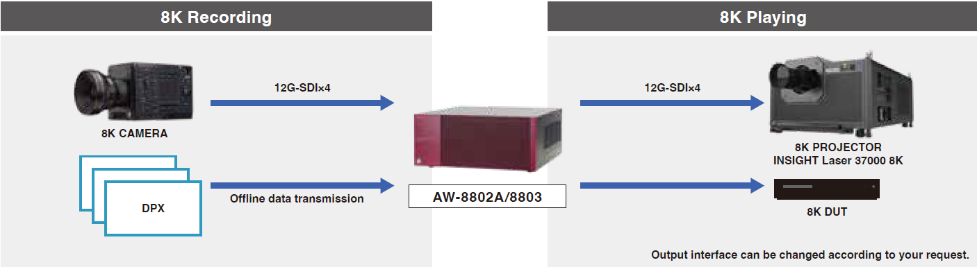 สามารถบันทึกและเล่นวิดีโอ 8K 60p แบบไม่บีบอัดได้ ช่วยให้คุณใช้วิดีโอคุณภาพสูงโดยไม่ถูกบีบอัด เหมาะสำหรับการถ่ายทำและฉายวิดีโอ 8K รวมถึงการวิจัยและพัฒนาอุปกรณ์ 8K