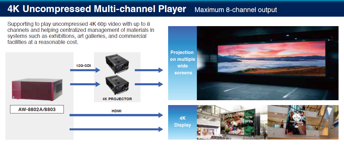 สามารถเล่นวิดีโอ 4K 60p แบบไม่บีบอัดได้สูงสุด 8 ช่อง ช่วยให้จัดการเนื้อหาวิดีโอได้อย่างมีประสิทธิภาพ เหมาะสำหรับระบบที่ใช้ในนิทรรศการ แกลเลอรีศิลปะ และสถานประกอบการเชิงพาณิชย์
