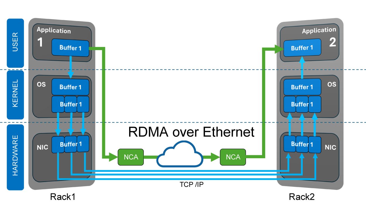 การใช้ RDMA บน Ethernet หมายถึงผู้ส่งเข้าถึงหน่วยความจำของ NIC โดยตรงเพื่อลดความหน่วงเวลาและเพิ่มอัตราการส่งข้อมูล