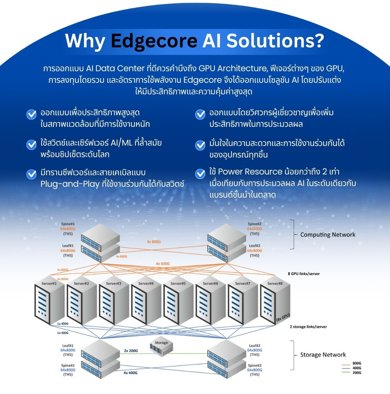 Edge-Core นำเสนอ NOS สำหรับสวิตช์ AI ที่เรียกว่า SONiC ซึ่งรองรับแพลตฟอร์มสวิตช์หลากหลาย โดยมี Switch Abstraction Interface (SAI) ตั้งแต่ 1G ถึง 800G รองรับตั้งแต่ Leaf Switch, Spine Switch จนถึงระดับ Super Spine Switch