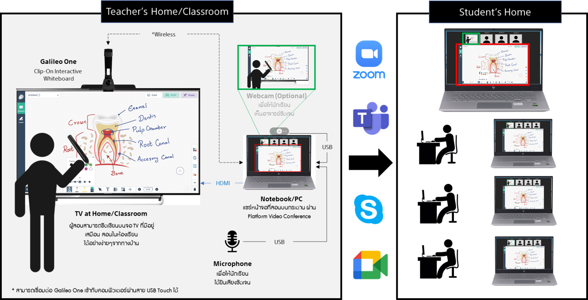 เปลี่ยนทีวีในห้องเรียนของท่านให้เป็นกระดาน Interactive เพียงติดตั้ง Galileo One Clip ไว้ที่กึ่งกลาง TV โดยสามารถแชร์หน้ากระดานที่ผู้สอนเขียนไปยังผู้เรียน ผ่านแพลตฟอร์มการประชุมออนไลน์ได้ในทันที