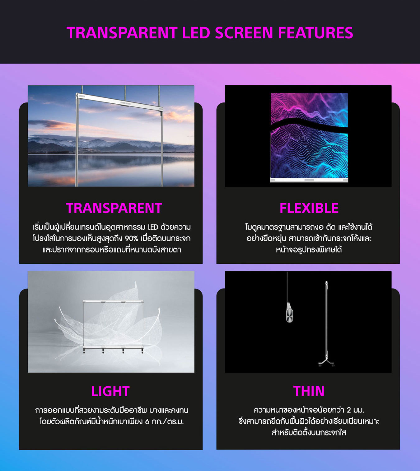 หลังจากการวิจัยและพัฒนามาหลายปี จอ Transparent LED ได้อัปเกรดหลายคุณสมบัติอย่างสมบูรณ์