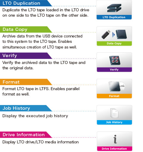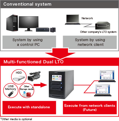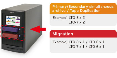 Like the conventional model, a drive to be mounted according to the customer's requirements can be customized. Wide range of LTO generation drive from LTO-4 until LTO-8 is available. For example, when your requirement is simultaneous archive to LTO-8, you can install 2 x LTO-8 drives. And when it is migration from LTO-5/6 to LTO-8, you can install 1 x LTO-6 and 1 x LTO-8.