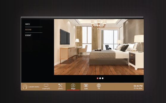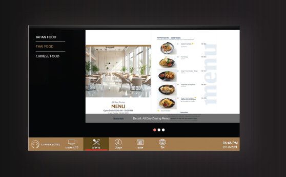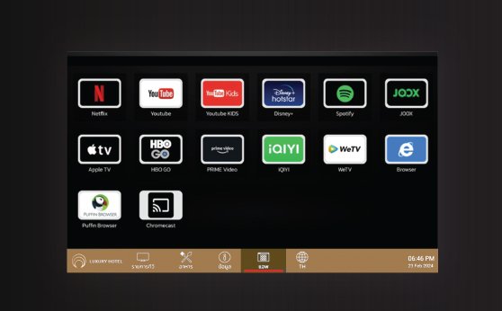 ระบบ IPTV (Internet Protocol television) คือเทคโนโลยีที่อาศัยโครงข่ายอินเทอร์เน็ต (Internet Protocol) แทนที่จะใช้สายเคเบิลหรือดาวเทียม ผู้ใช้สามารถรับชมรายการโทรทัศน์ผ่านอุปกรณ์ต่างๆ เช่น สมาร์ททีวี กล่องรับสัญญาณ IPTV คอมพิวเตอร์ หรือสมาร์ทโฟน ช่วยในการส่งสัญญาณภาพและจัดการข้อมูล TV ของห้องพักทุกห้องให้เป็นระบบเดียวกัน พร้อมระบบบริหารจัดการข้อมูลแบบ real-time