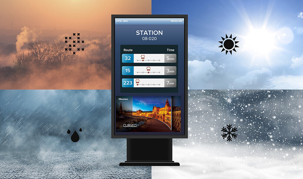 การรองรับระดับ IP65 และ IP55 ให้การป้องกันฝุ่นและน้ำอย่างสมบูรณ์แบบ สร้างขึ้นในระบบทำความร้อนและความเย็นอัจฉริยะ พร้อมระบบหมุนเวียนอากาศอัตโนมัติอัจฉริยะ มีกระจกป้องกันการทุบทำลายเพื่อการปกป้องจากสภาวะแวดล้อมที่รุนแรงและผลกระทบที่อาจเกิดขึ้นได้ต่อจอแสดงผล